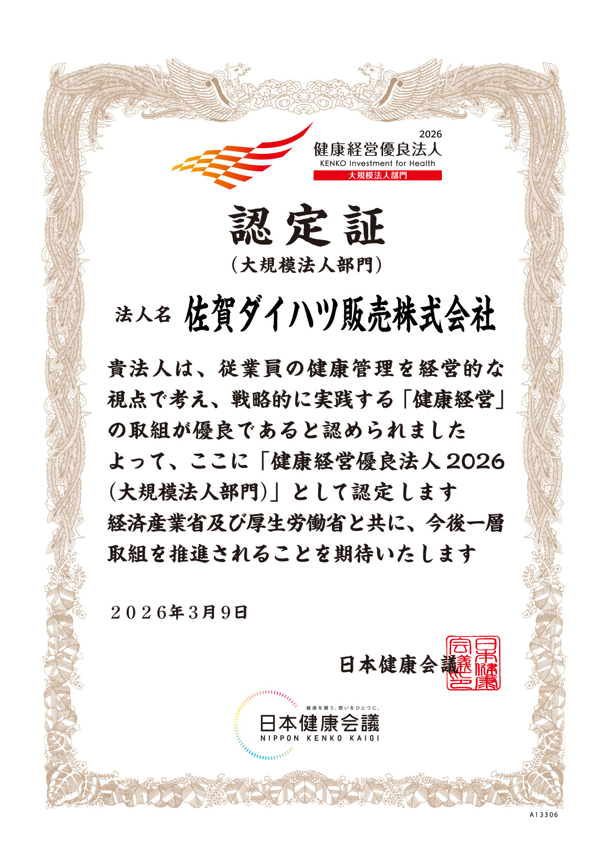 お客様の安心と信頼を獲得し、お客様の満足と感動を追求するため、佐賀ダイハツで働く従業員の皆さんが、「明るく、楽しく、元気に」輝けるよう、全社を挙げて「健康経営」に取り組むことを宣言いたします。