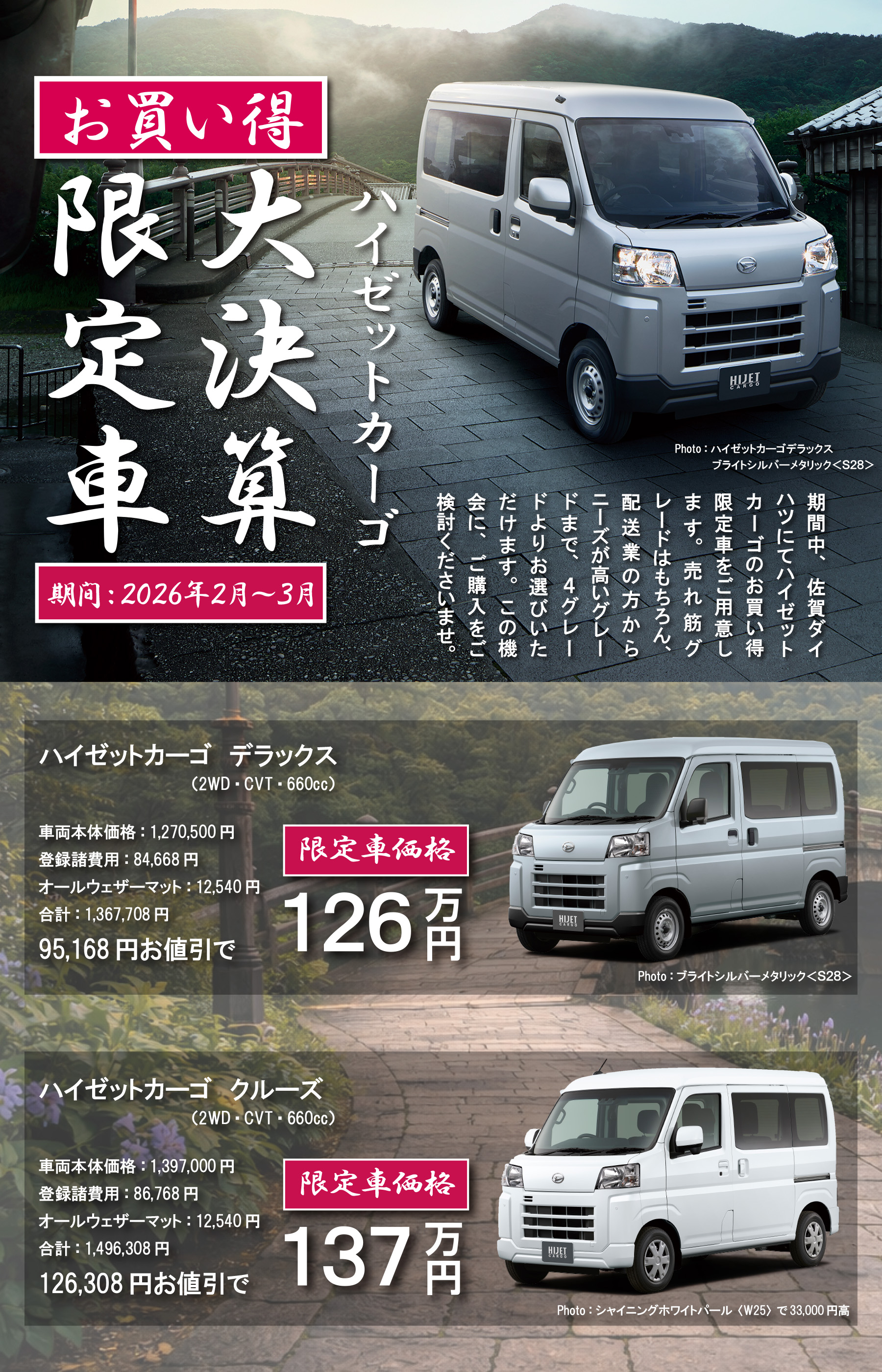 ■限定車価格については、2月1日~3月31までにご成約、かつ3月末までの登録が条件となります。■既にご成約済みの車両にさかのぼって適用することはできません。■限定車価格については用品取付けが条件となります。■限定車価格には、自賠責保険料、税金(消費税含む)、登録諸費用、リサイクル料は含まれておりますが、車庫証明費用・指定場所への納車費用・希望ナンバー費用、マット以外のディーラーオプション・メーカーオプション費用等は含まれておりません。別途必要となります。■価格は全て消費税込みの価格です。