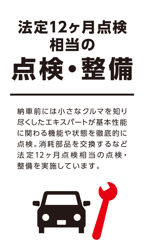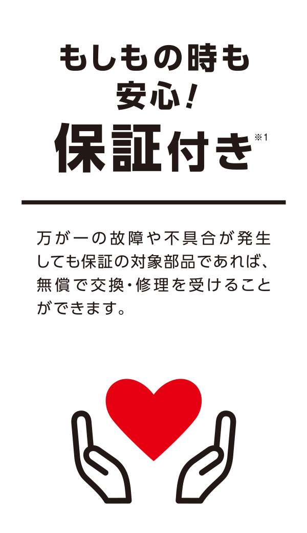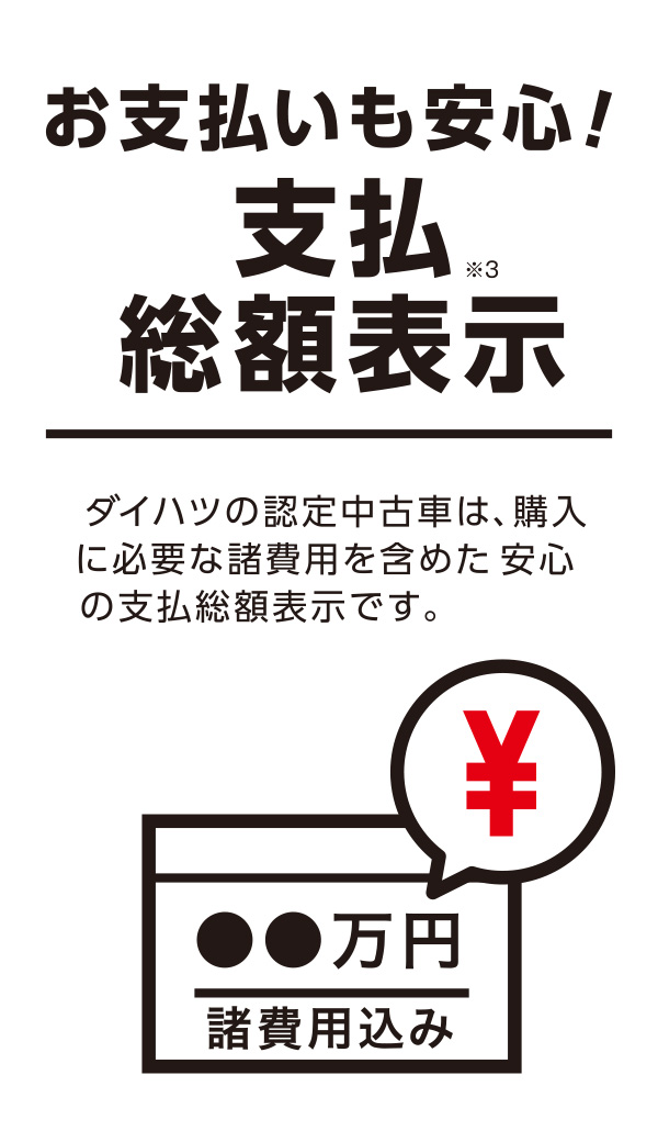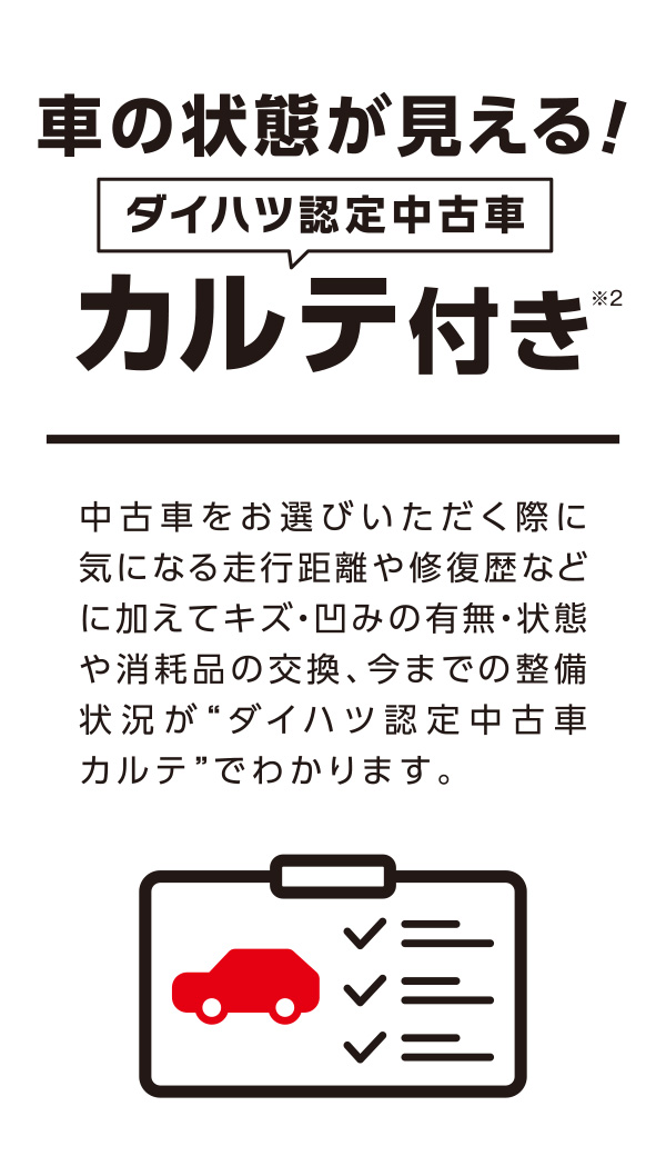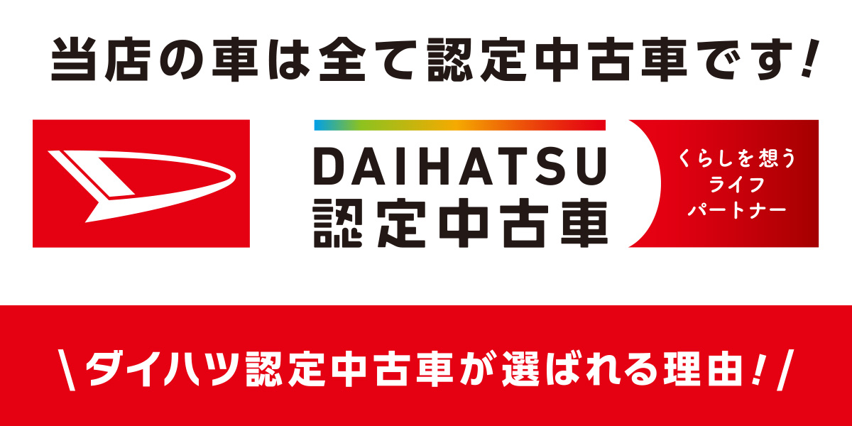 ※1.保証の期間・内容は車により異なる場合がございます。※2.お車の情報は、展示車に設置のダイハツ認定中古車カルテもしくは、ダイハツ認定中古車・軽自動車 公式情報サイトU-CATCHの車両情報欄にてご確認いただけます。なお、車の状態により一部情報は不明な場合もございますのであらかじめご了承ください。※3.お客様のご要望に基づくオプション費用、販売店の所在地を管轄する陸運局以外での登録費用、自宅など指定場所への陸送費用、下取手続き費用などは含まれておりません。■詳しくは、営業スタッフまでお問い合わせください。