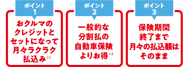 • 「コンビにプラン」は「ローン・リースの自動車に関する保険料分割払特約」(注)および「ローン・リースの自動車保険に関する特約(保険料分割払方式)」(注)がセットされたあいおいニッセイ同和損害保険株式会社の長期自動車保険のペットネーム、「カップるプラン」は「ローン・リースの自動車保険に関する特約(保険料分割払方式)」および「ローン・リースの自動車に関する保険料分割払特約」がセットされた三井住友海上火災保険株式会社の長期自動車保険のペットネーム、「まとめてバリュープラン」は「ローン・リースによる自動車に関する保険料分割払特約」および「ローン・リースの自動車保険に関する特約(保険料分割払方式)」をご契約の東京海上日動火災保険株式会社の長期自動車保険のペットネーム、「クレぴたプラン」は「ローン・リースの自動車保険に関する特約(保険料分割払方式)」を付帯した損害保険ジャパン株式会社の長期自動車保険のペットネームです。